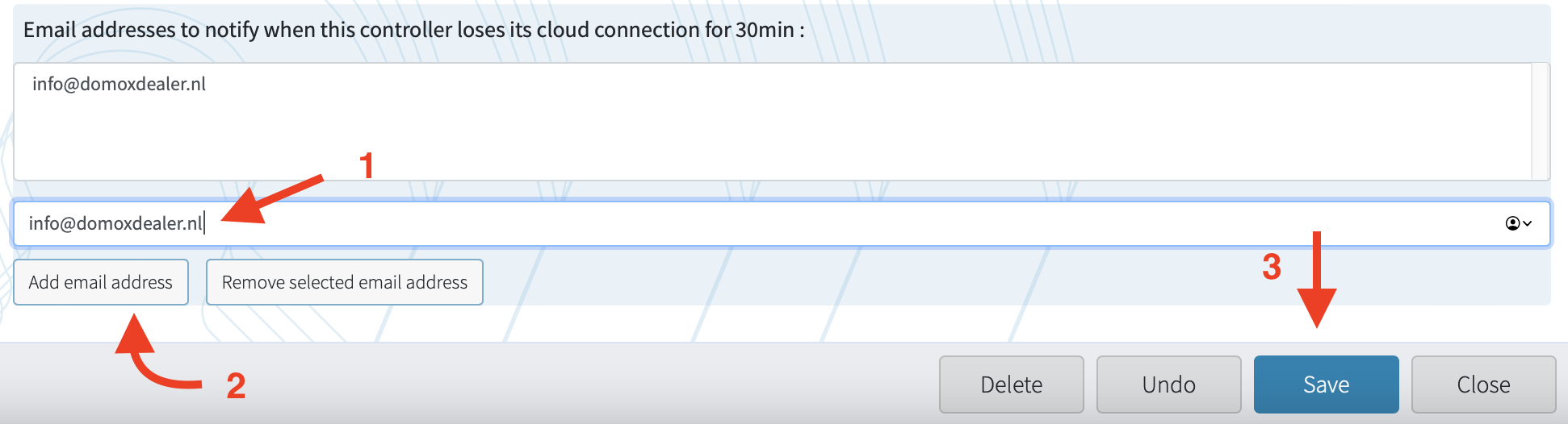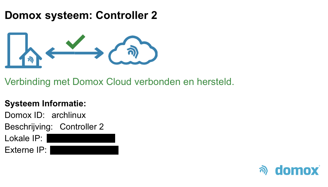 In het portaal kunnen email adressen aan een controller worden toegevoegd (ieder gewenst email adres), die een email notificatie ontvangen als de verbinding tussen de lokale Domox controller én de Domox Cloud voor ten minste 30min verbroken is.