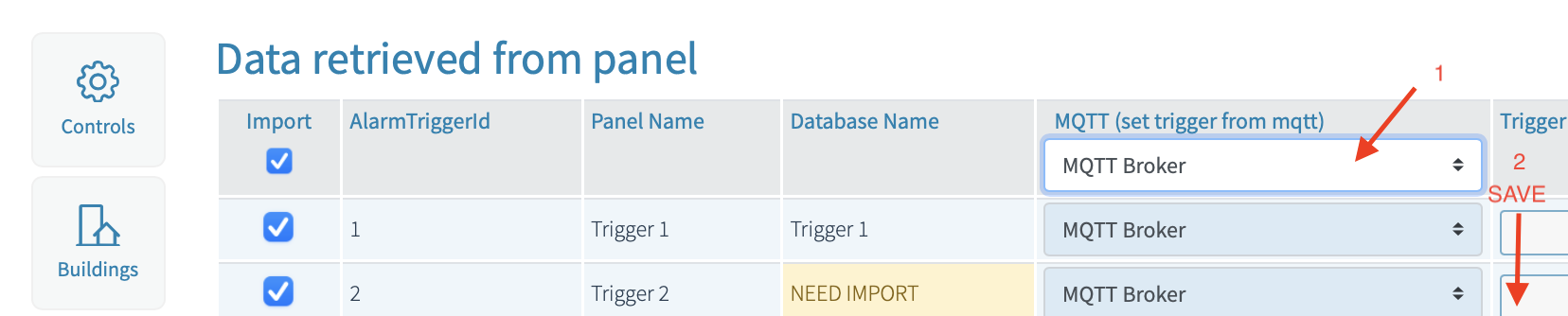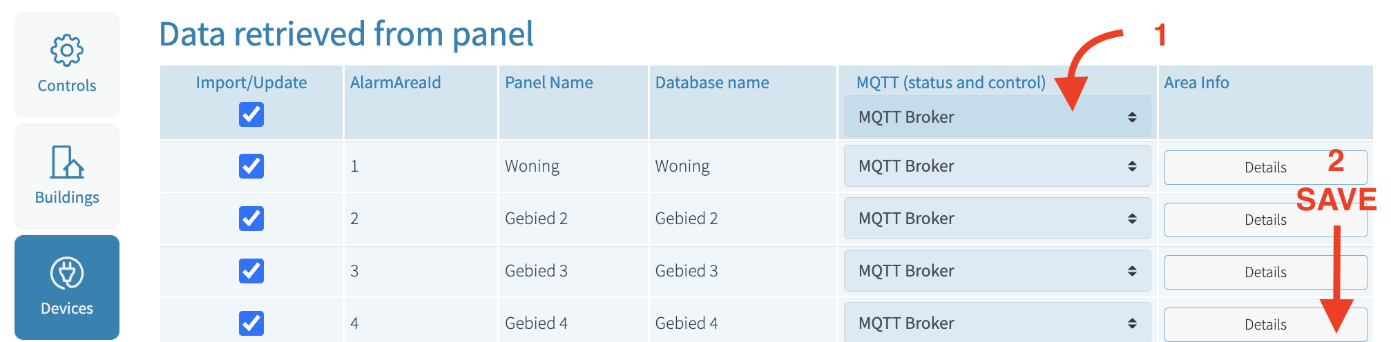 - Klik op MQTT (status and control) → selecteer het MQTT device → Save (indien alle gebieden gekoppeld moeten worden):