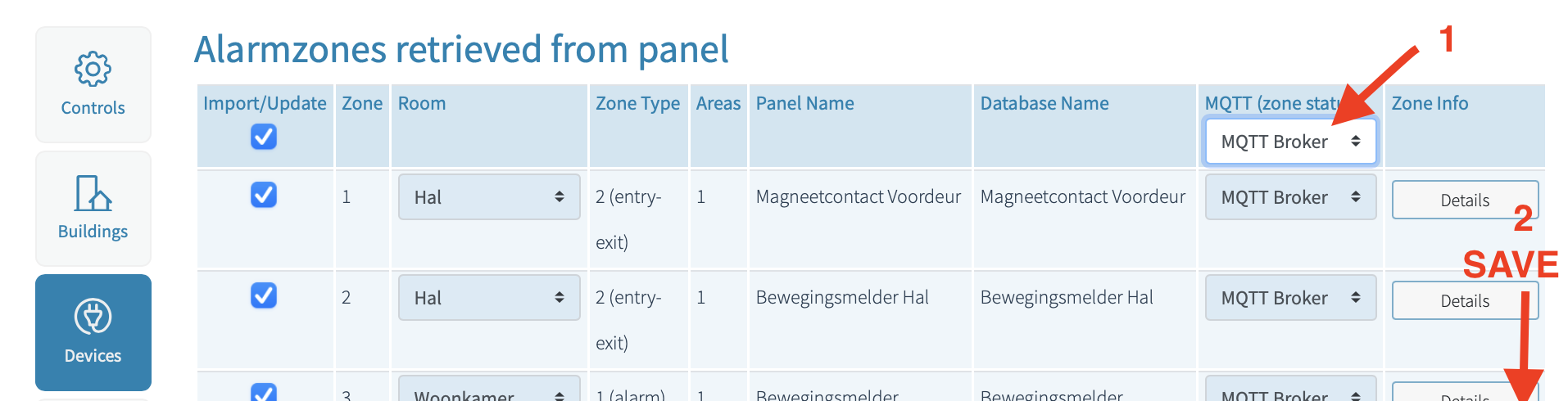 - Klik op MQTT (status) → selecteer het MQTT device → Save (indien alle zones gekoppeld moeten worden):