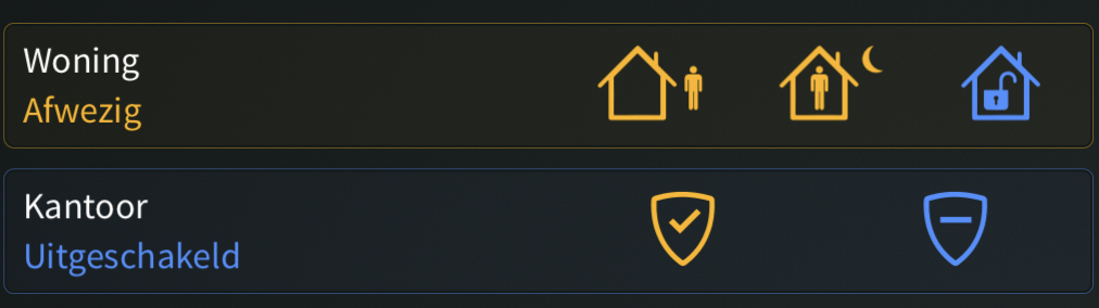 Onderstaand voorbeeld rijen met de huidige status Woning Afwezig (ingeschakeld) en een rij Kantoor Uitgeschakeld :
