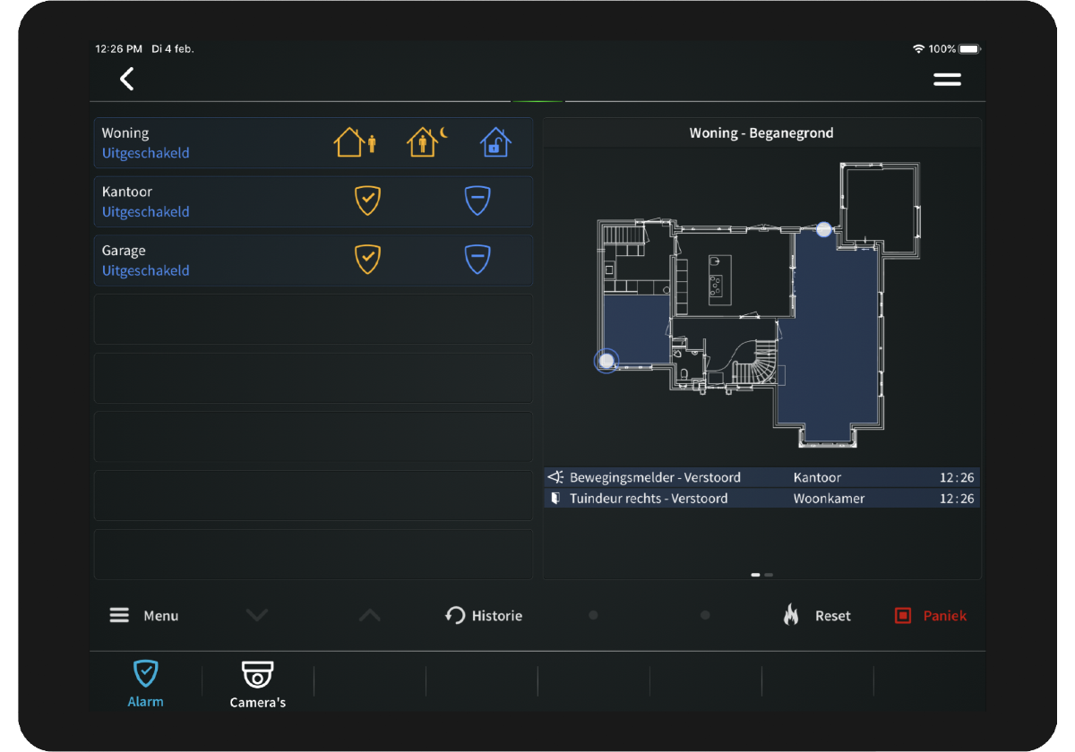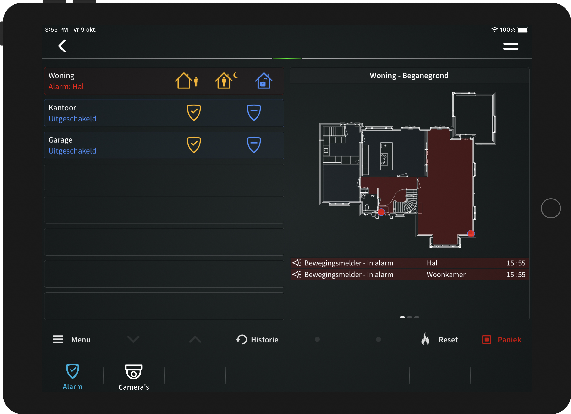 - de rij van het gebied zal rood oplichten met de vermelding in welke ruimte er een alarm is
