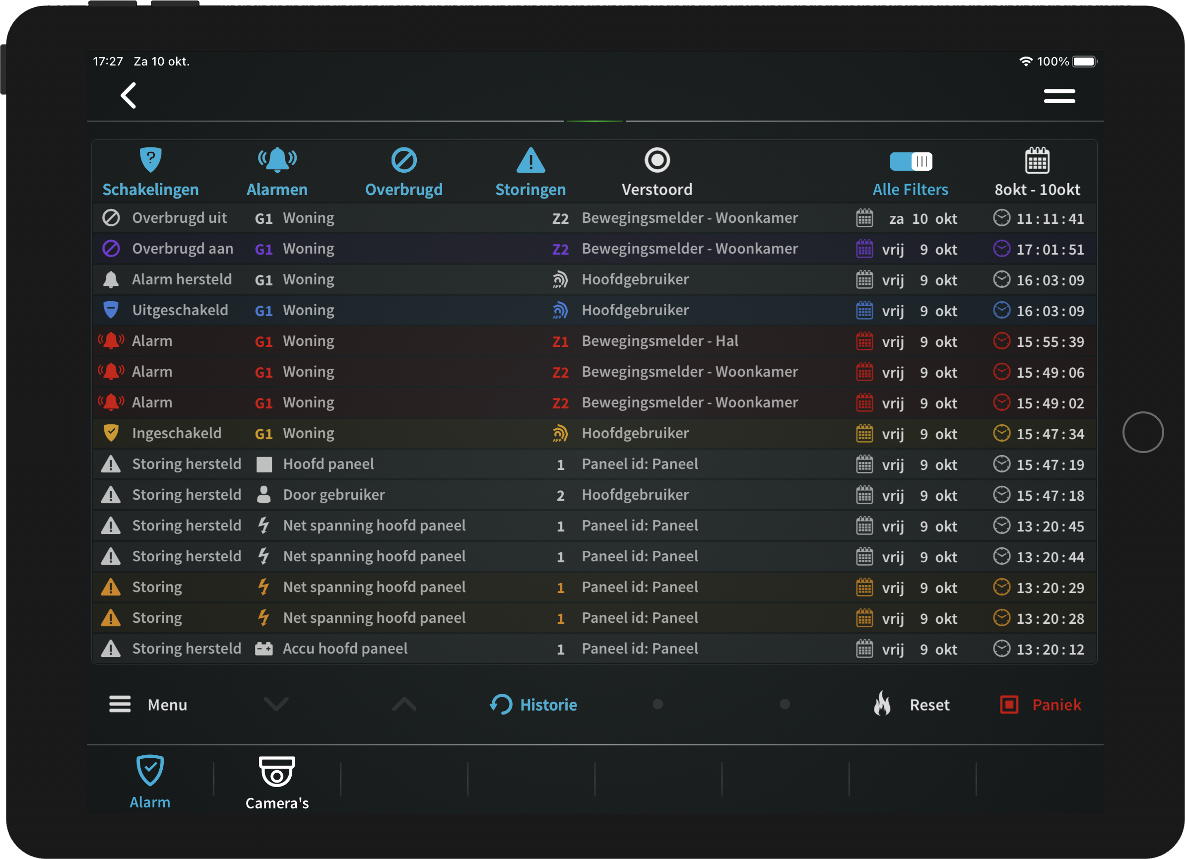 De knop historie geeft een uitgebreid overzicht van meldingen/activiteiten die op het alarm paneel zijn uitgevoerd.