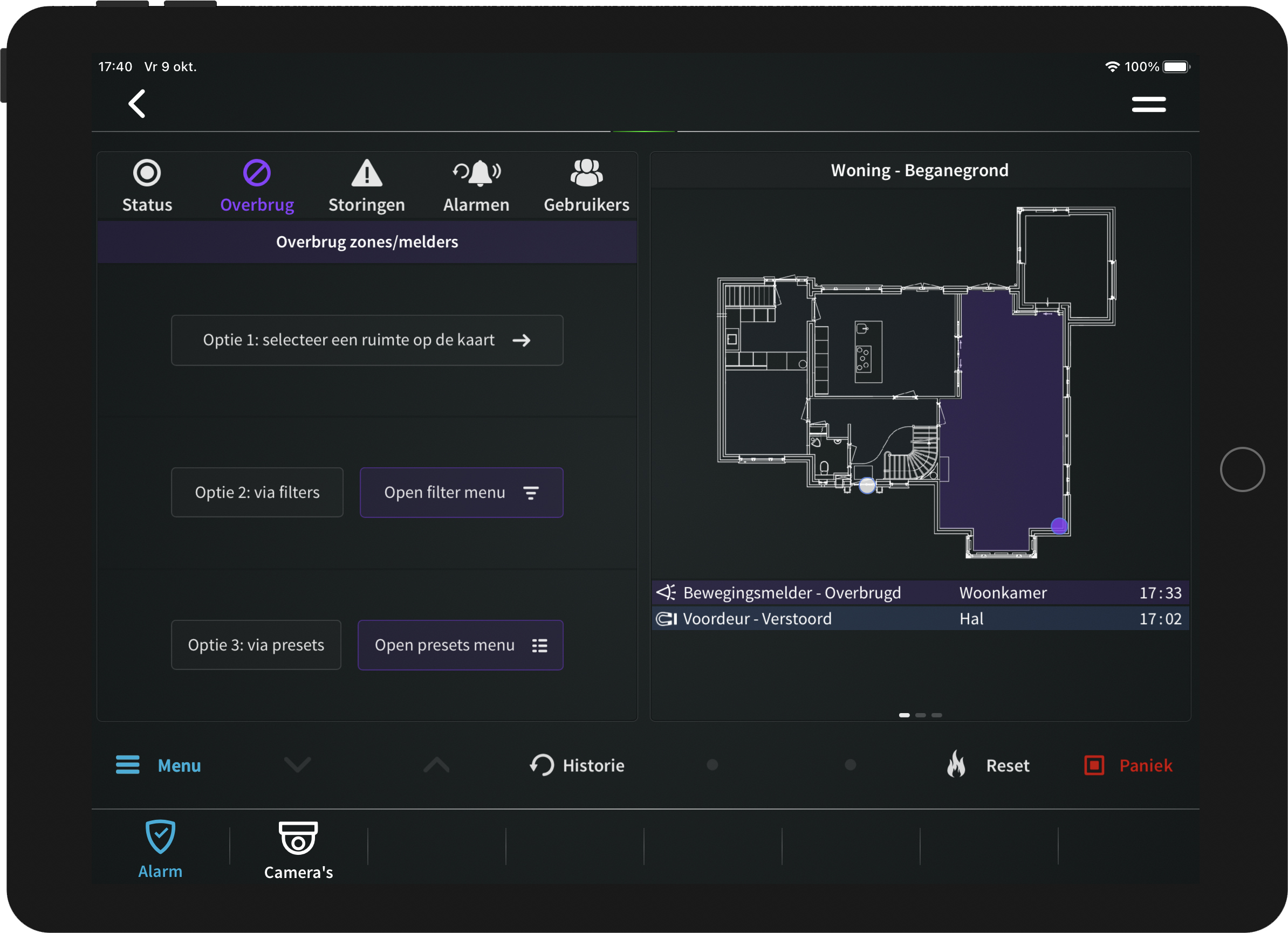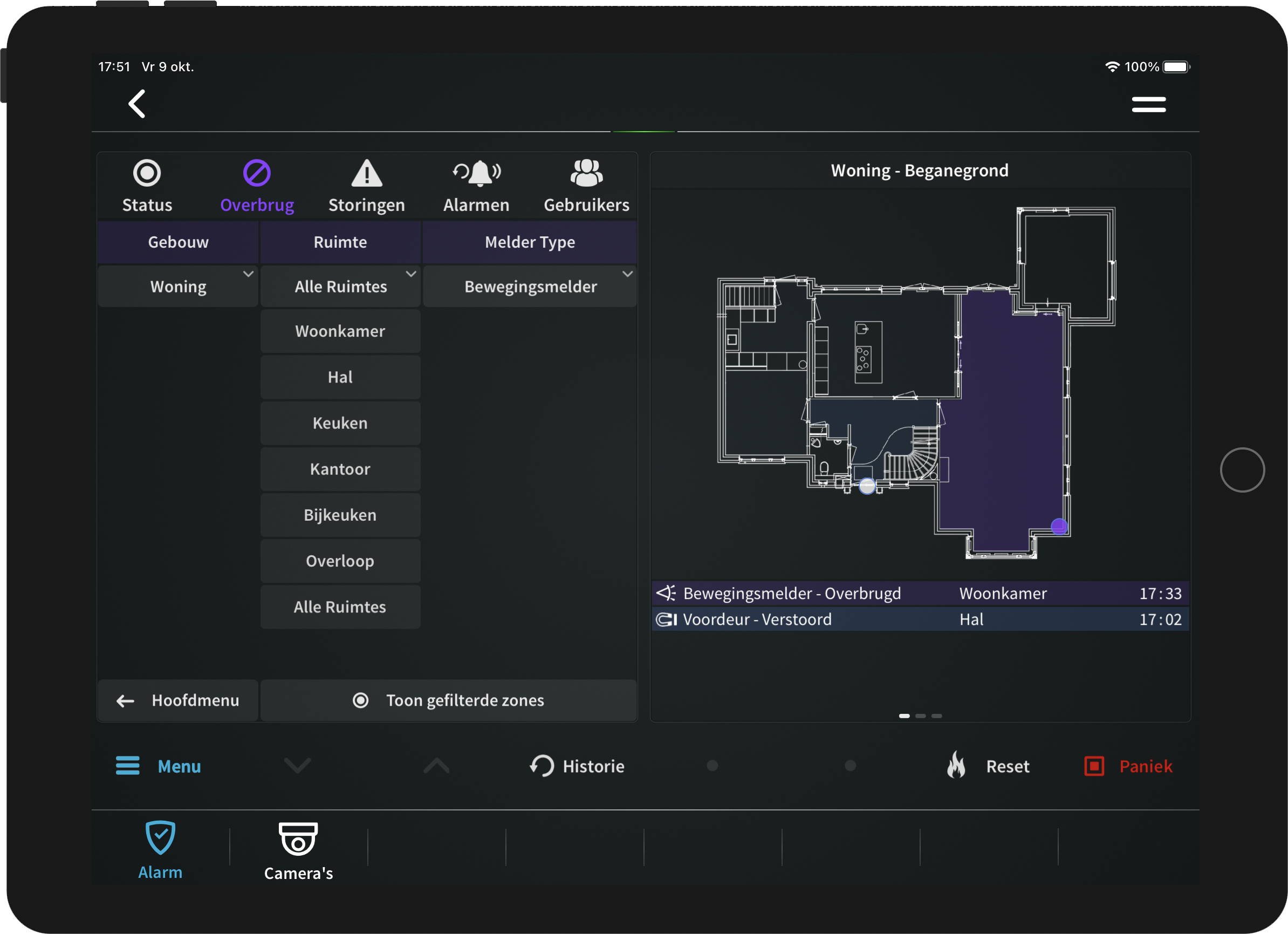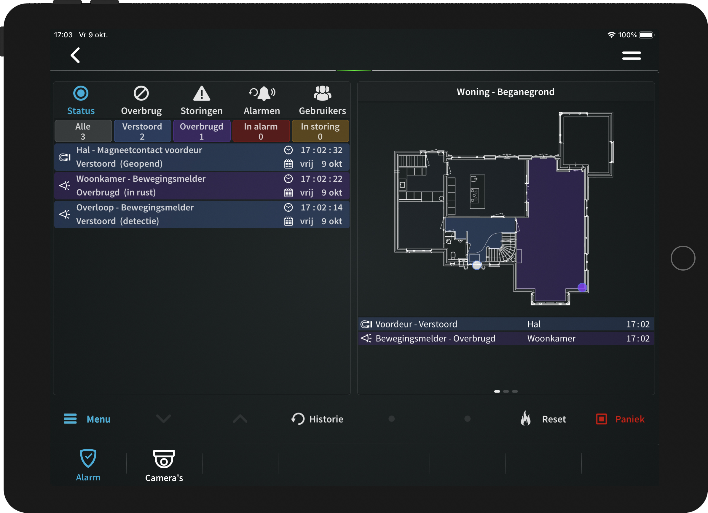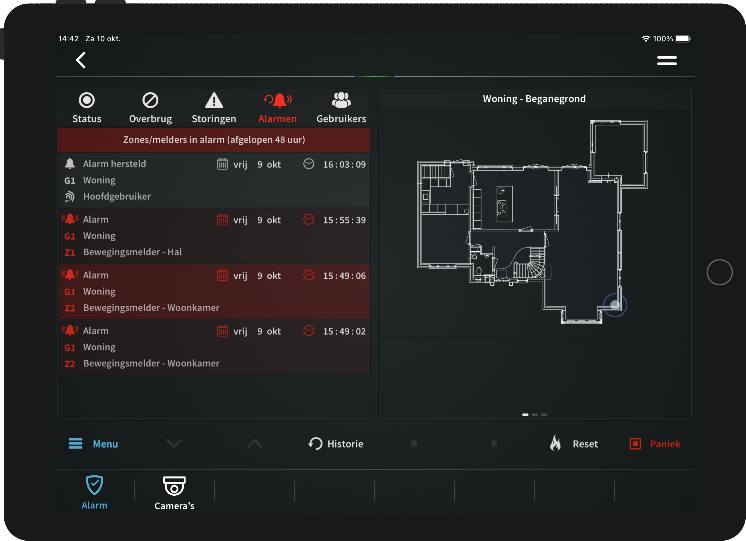 - onder de kaart zullen de zones die in alarm staan tekstueel worden getoond (symbool, beschrijving, status, ruimte en tijdstip)