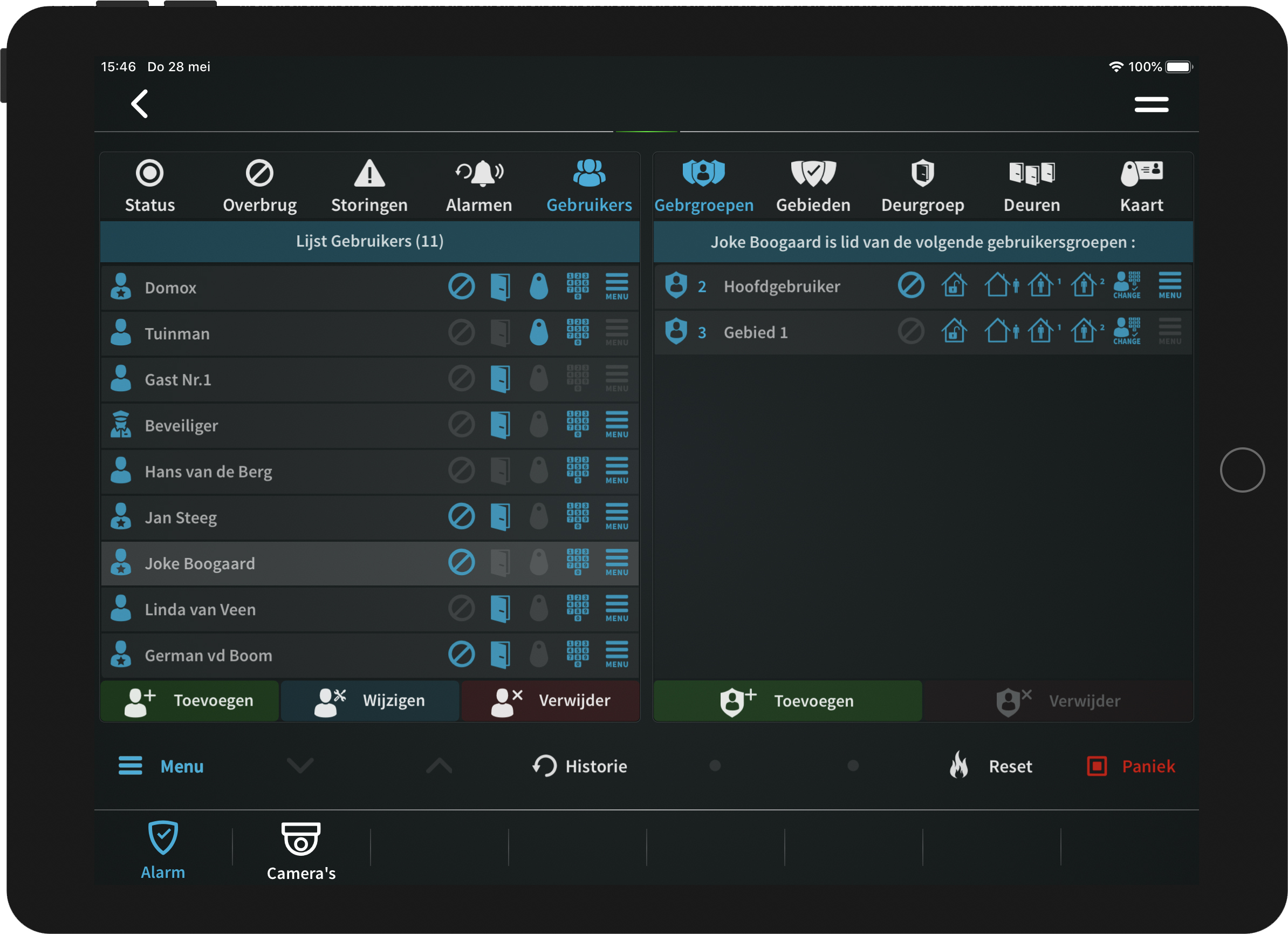 Het menu gebruikers geeft een overzicht van alle gebruikers die in het alarm paneel staan.